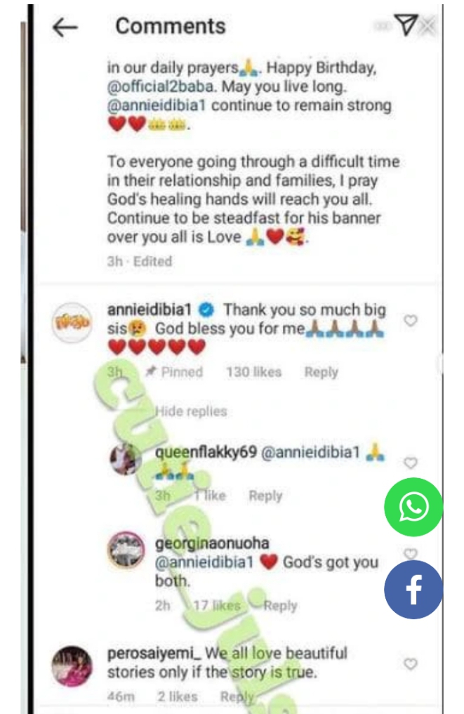 You both and your entire families, as well as all connected to you guys, are in our daily prayers?. Happy Birthday, @official2baba. May you live long. @annieidibia1 continue to remain strong ❤️❤️??, she wrote.