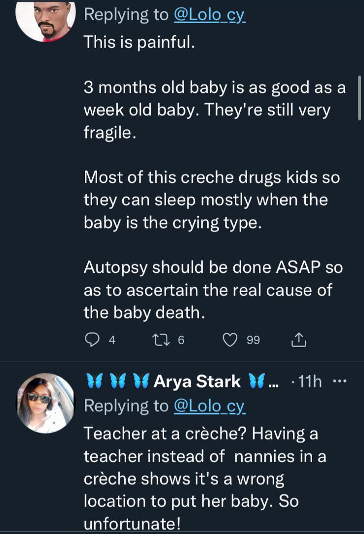 “A friend dropped her 3 months old healthy baby at creche and she came back to pick his dead body. Nobody understands what happened