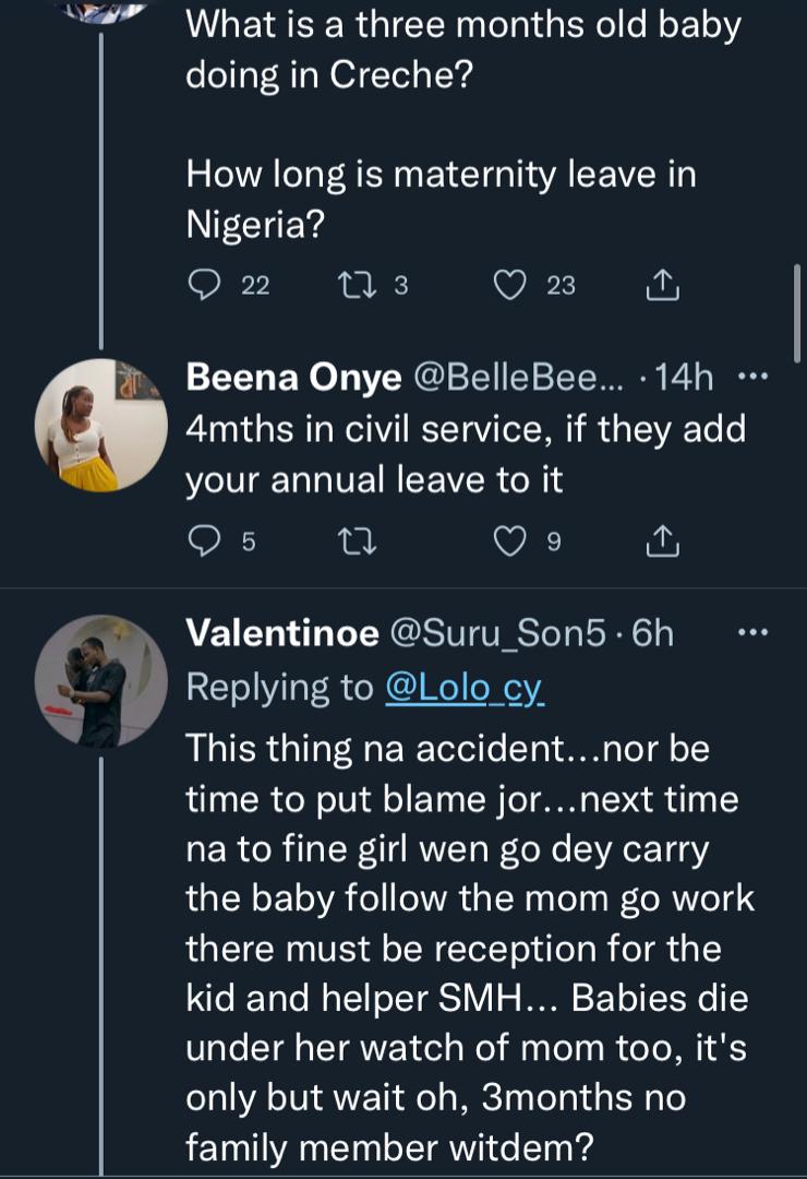 The tragic loss, however, was met with mixed reactions from internet users who questioned the duration of maternity leaves in Nigeria.