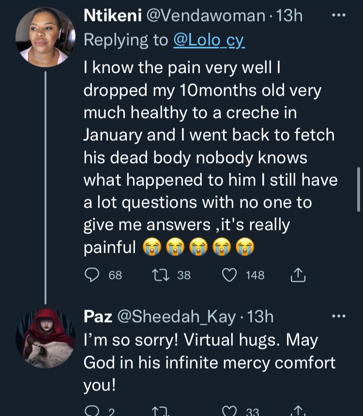 My God in heaven! I am beyond hurt. This woman just wanted to get back to her job and needed somewhere safe to keep her baby. She found a creche literally 2 mins from home. God!!!!! This is too much,” she wrote.