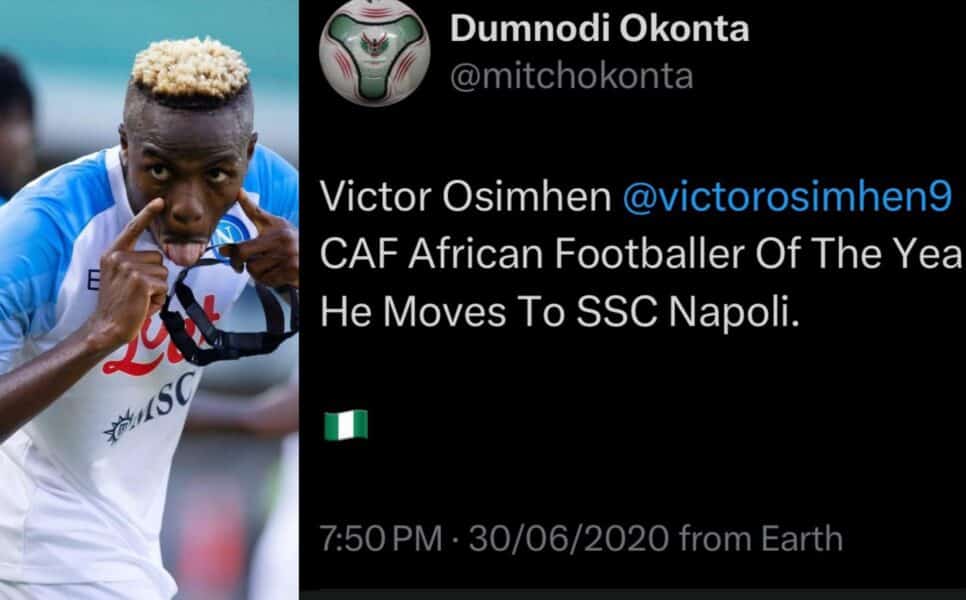 A tweet by a certain Dumnodi Okonta on Twitter, dated June 30, 2020, predicted that Osimhen would win the African Best Player award if he joined Napoli.