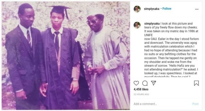 “I look at this picture and tears of joy freely flow down my cheeks. It was taken on my matric day in 1986 at UNIFE now OAU. Earlier in the day I stood forlorn and downcast,” he wrote on Thursday.