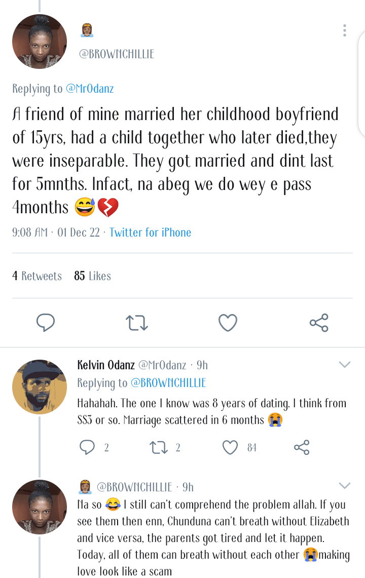 “A friend of mine married her childhood boyfriend of 15yrs, had a child together who later died,they were inseparable. They got married and dint last for 5mnths. Infact, na abeg we do wey e pass 4months 😅💔.