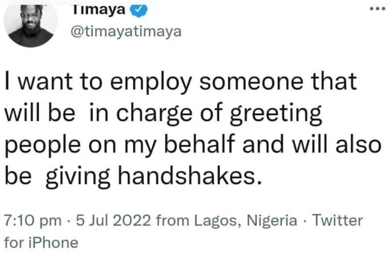 Taking to his Twitter handle, the music star disclosed that he wants to employ an individual who will be in charge of greeting people on his behalf as well as giving and receiving handshakes.