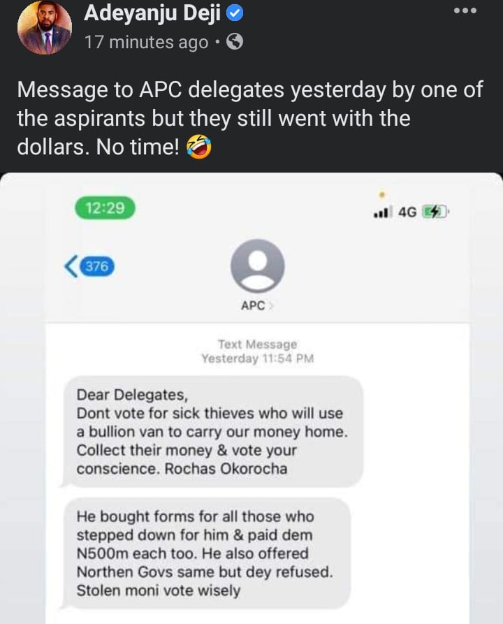 Deji, who reacted with a screenshot of the text message wrote: “Message to APC delegates yesterday by one of the aspirants but they still went with the dollars. No time! 🤣.”