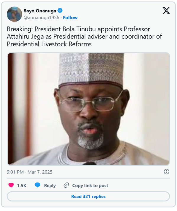 The announcement was made on Friday, March 7, by the president’s special adviser on information and strategy, Bayo Onanuga, via a post on the social media platform X (formerly Twitter).