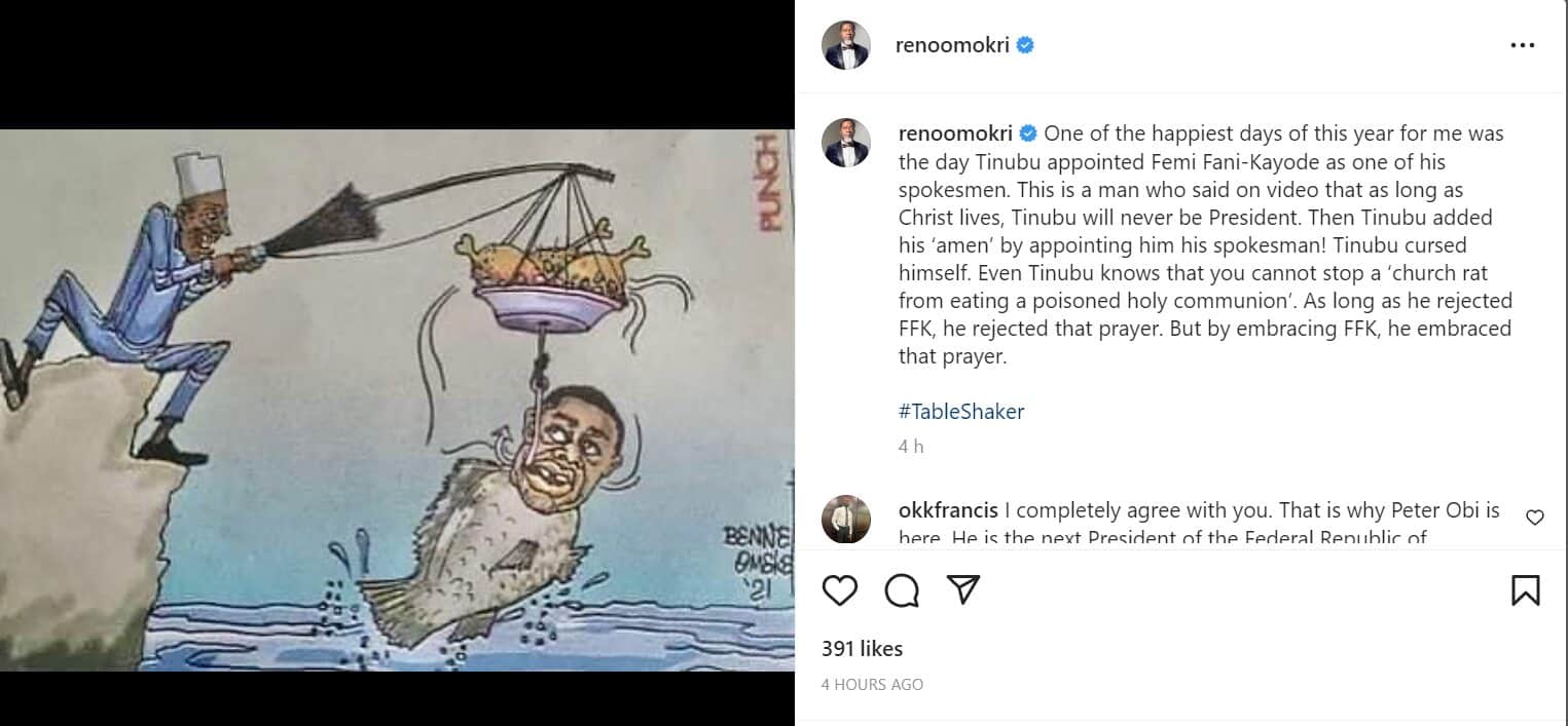 Recounting how Femi Fani-Kayode had in the past sworn that Tinubu “will never be President as long as Christ lives”, Reno Omokri claimed that the APC presidential candidate cursed himself with the appointment.