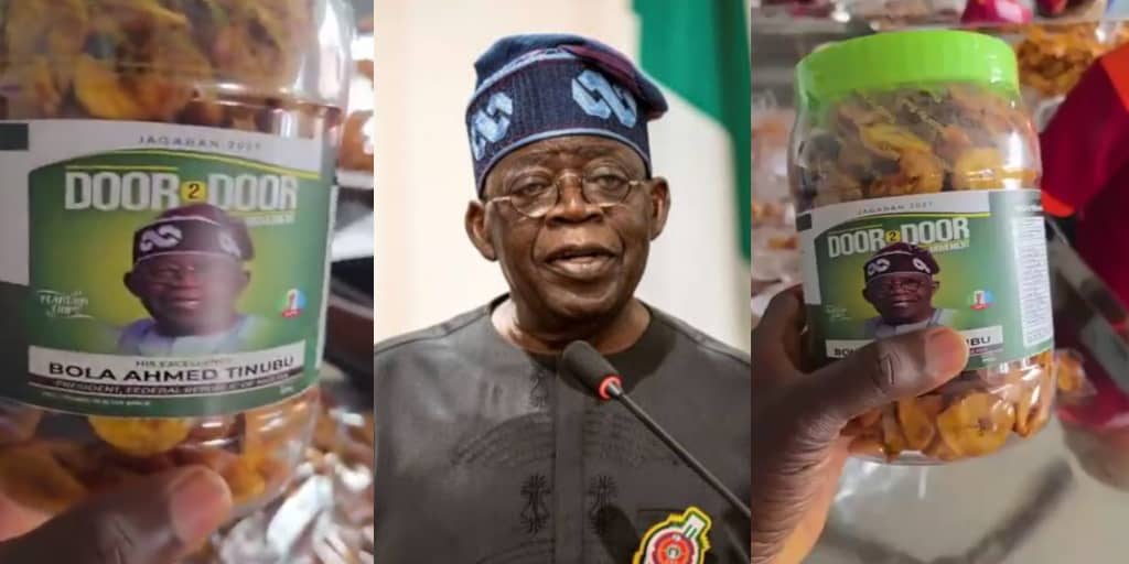 The President of Nigeria, Bola Tinubu, has allegedly begun his 2027 campaign as a video showing plantain chips and sachets branded with his image and the words “Door 2 Door, Jagaban for 2027” surfaced online.