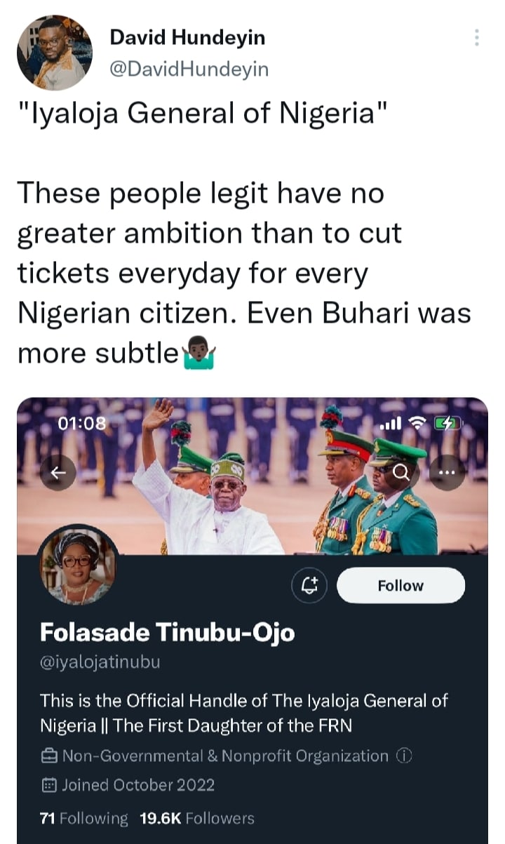 “Iyaloja General of Nigeria. These people legit have no greater ambition than to cut tickets every day for every Nigerian citizen. Even Buhari was more subtle.”