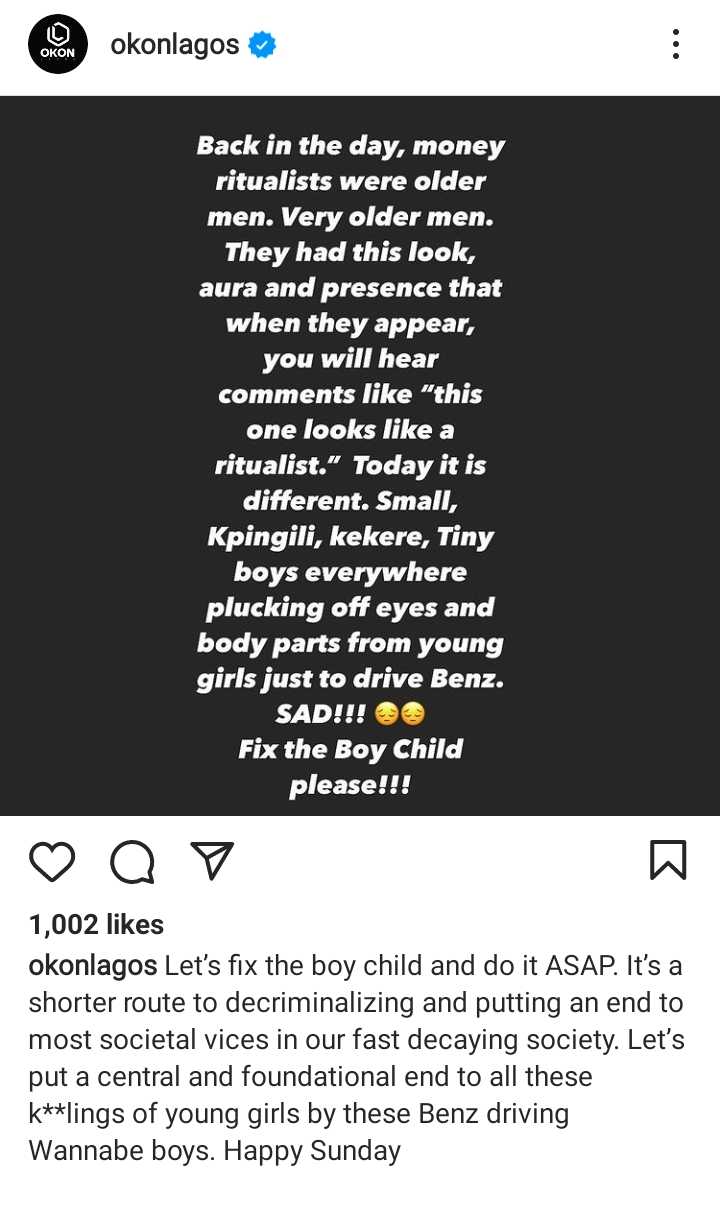 Today, it is different. Small, Kpingili, kekere, tiny boys are everywhere plucking off eyes and body parts from young women just to drive Benz. Sad. Fix the Boy Child please.”