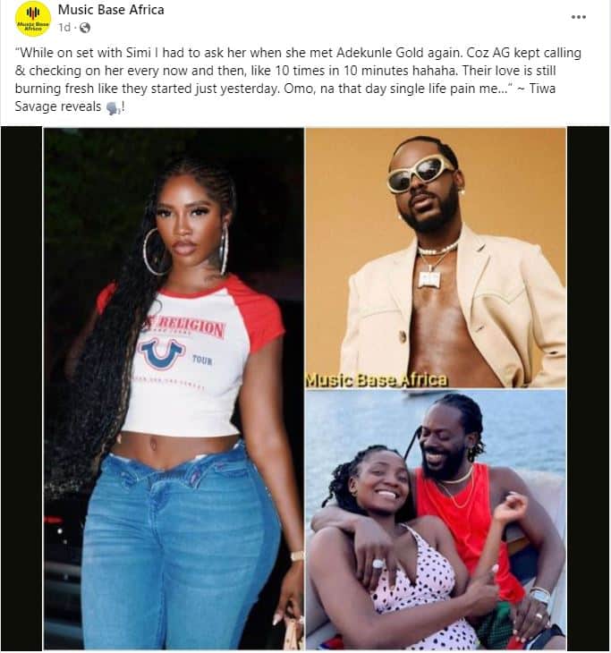 Tiwa Savage gushes over Adekunle Gold and Simi’s love, regrets single life
