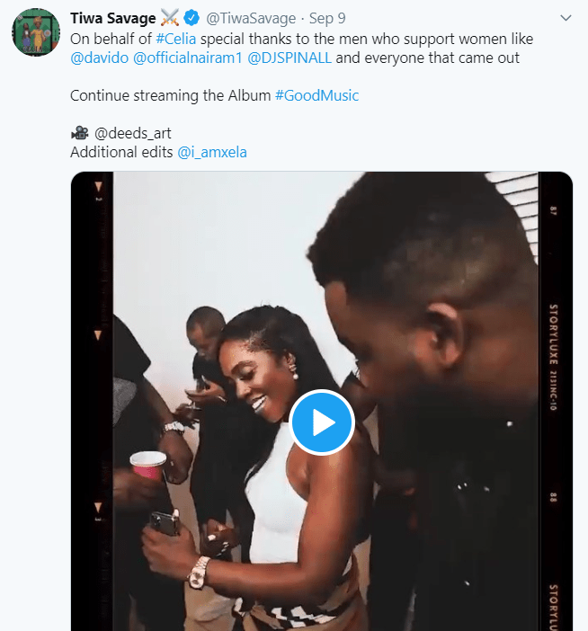 “On behalf of #Celia special thanks to the men who support women like @davido @officialnairam1 @DJSPINALL and everyone that came out continue streaming the album #GoodMusic,” she wrote on Twitter.