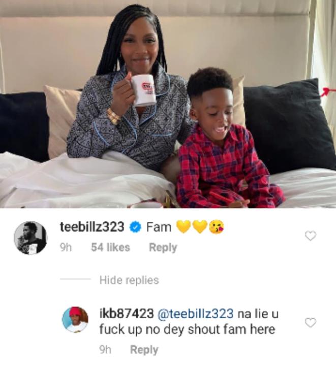 Tiwa Savage shared a photo of herself and their son, Jamil on Instagram, and TeeBillz took to the comment section to send out his love.