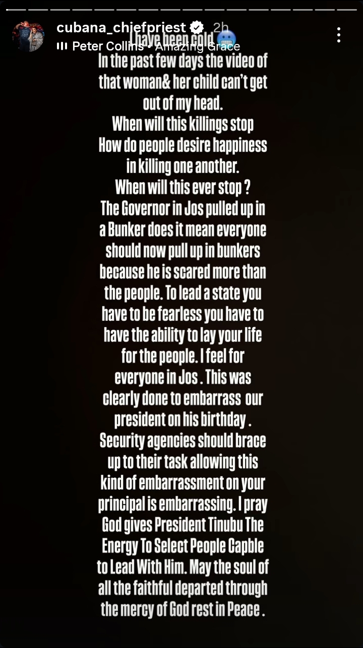 Nigerian socialite and entrepreneur, Cubana Chief Priest has reacted to the recent killings of residents in Jos, Plateau State.