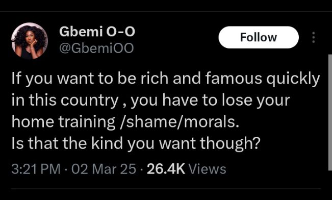 In a tweet on Sunday, Gbemi lamented that people now have to lose their morals in order to make it fast.