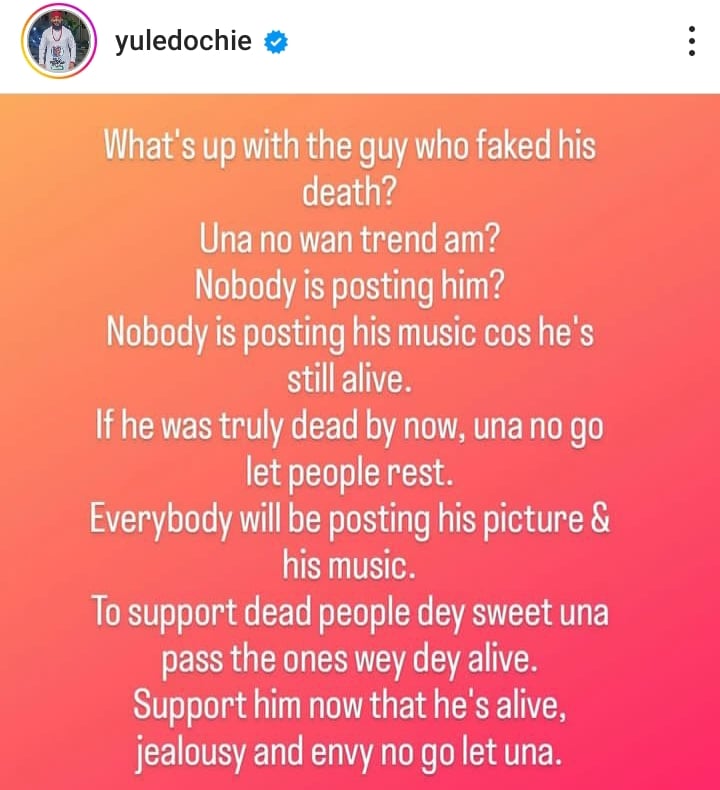 Yul Edochie opined that people are no longer posting the musician because he is alive.