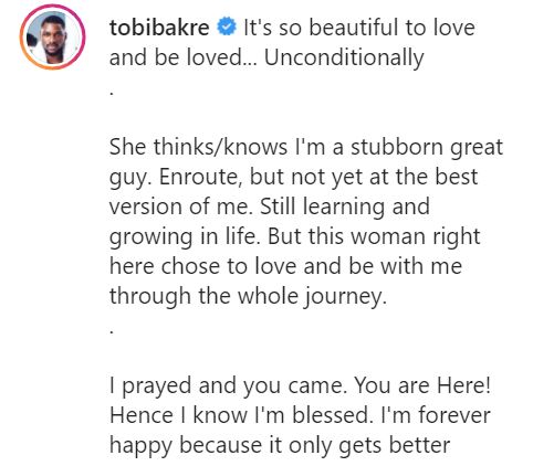 I prayed and you came. You are Here! Hence I know I’m blessed. I’m forever happy because it only gets better,” Tobi Bakre wrote.