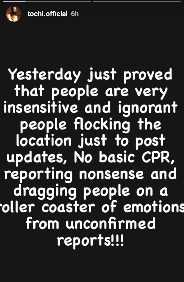 On his Instagram story, Tochi addressed the callous and inconsiderate people who flocked the scene of the boating accident, which took the lives of Junior Pope and other crew members, only to post updates.