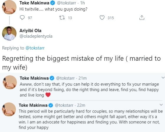 Toke Makinwa on Friday afternoon reached out to a Nigerian man who stated that he regrets marrying his wife.