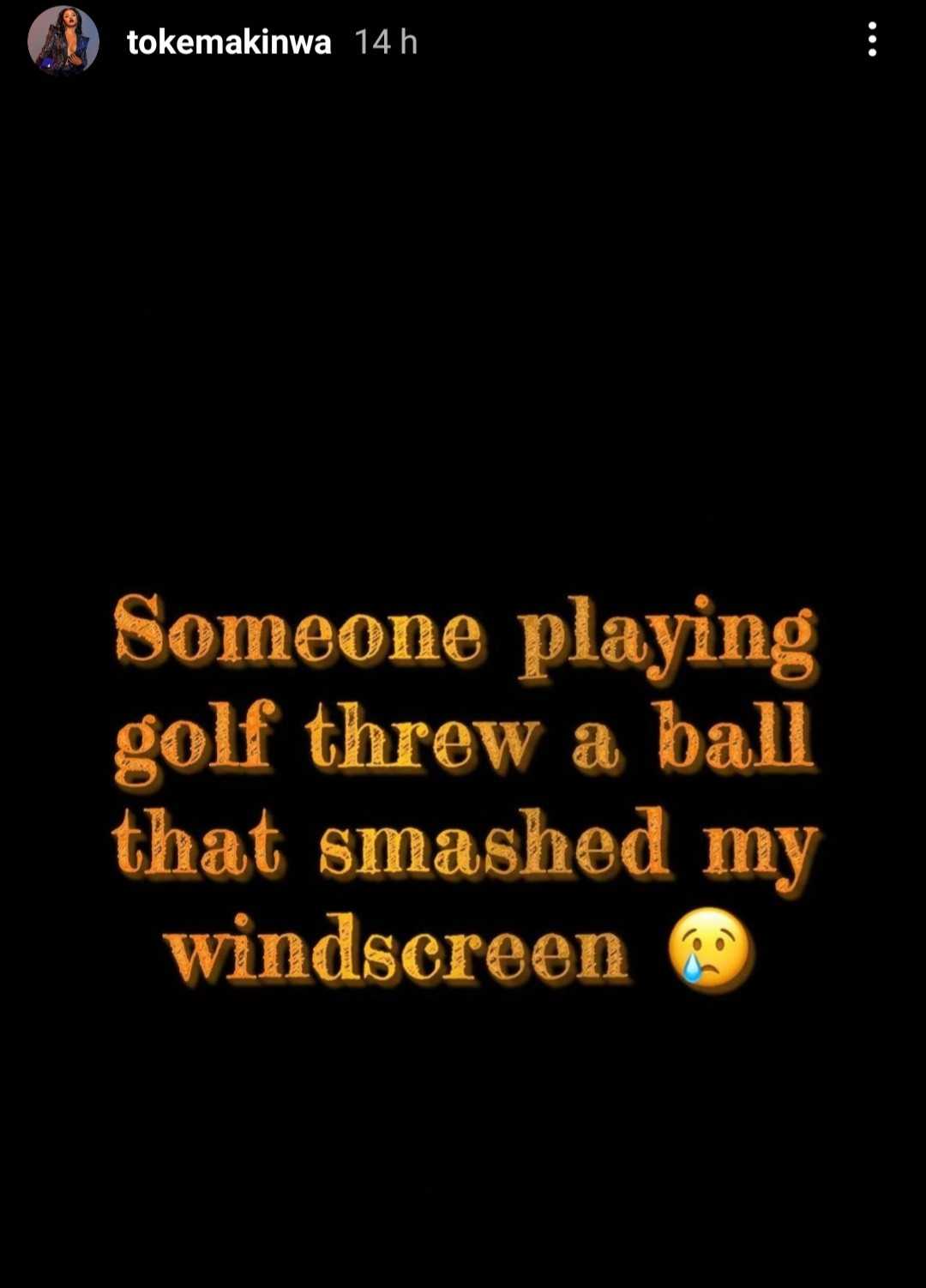 Toke Makinwa Laments As Golf Player Smashes Windscreen Of Her Car (Photo)