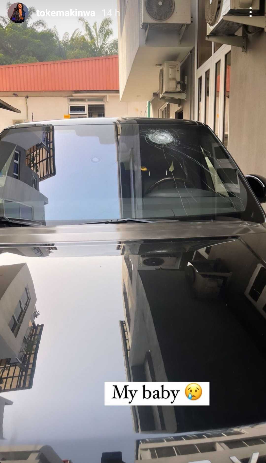 Popular On-Air Personality, Toke Makinwa has been left in disarray as her car’s windshield was left damaged.