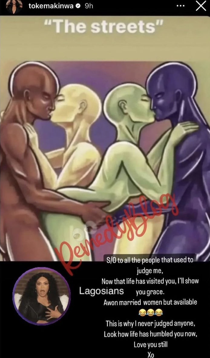 Nigerian vlogger and entrepreneur, Toke Makinwa takes a swipe at married women, particularly celebrities who judged her single status but are back on the street or cheating in their marriage.