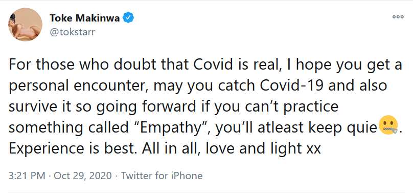 Recall we reported earlier today that Toke Makinwa revealed she had tested positive for Covid-19 and also shared her experience.