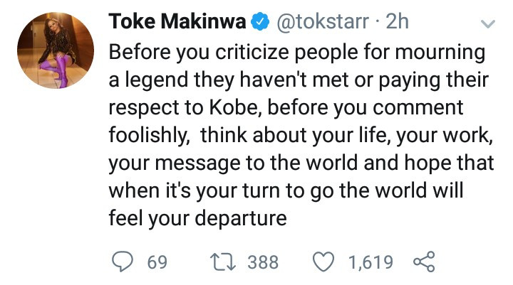 Toke Makinwa replies those criticizing people mourning Kobe Bryant who they’ve never met