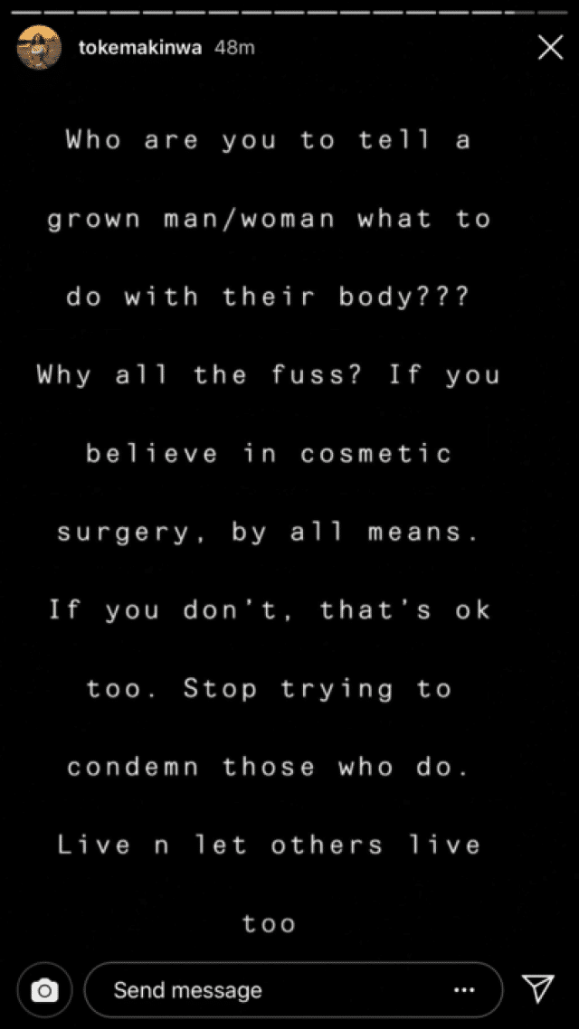 Holding on to this message, surgically enhanced, Toke Makinwa reposted it on her page and further slammed the critics.