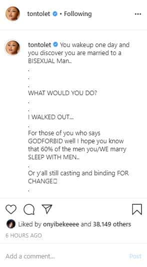 “You wakeup one day and you discover you are married to a BISEXUAL Man.. WHAT WOULD YOU DO? I WALKED OUT… For those of you who says GOD FORBID well I hope you know that 60% of the men you/WE marry SLEEP WITH MEN.. Or y’all still casting and binding FOR CHANGE”