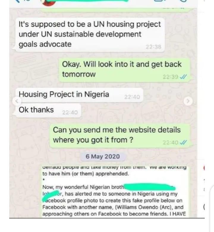 “From the 2nd slide you can read a WhatsApp conversation I had with my Uncle last year who would have been scammed to transfer his hard earned retirement money worth millions ! They approached him to contribute money for a fake “UN Housing project in Nigeria” to bring some millions for the projet to be awarded and after he’ll make profits…My further investigation proved that their website is creepy and Facebook account is filled with fake charity projects they’re claiming to represent the UN but it’s not true.
