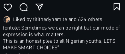 “Sometimes we can be right, but our mode of expression is what matters. This is an honest plea to all Nigerian youths. Let’s make smart choices,” Tonto Dikeh’s memo caption read.