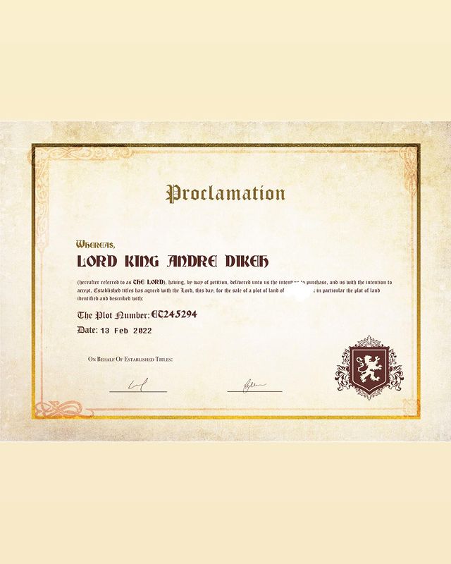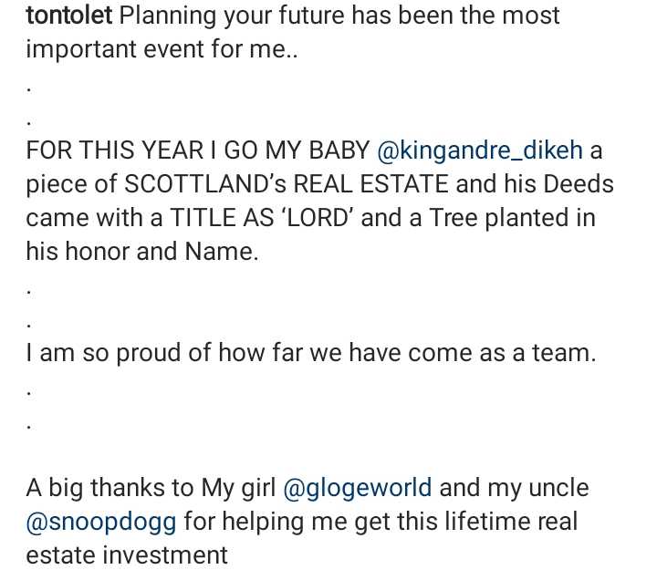 FOR THIS YEAR I GO MY BABY @kingandre_dikeh a piece of SCOTTLAND’s REAL ESTATE and his Deeds came with a TITLE AS ‘LORD’ and a Tree planted in his honor and Name.