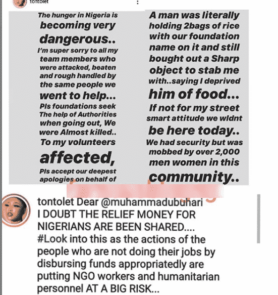 The mother of one however called on president Muhammadu Buhari to tell him Nigerians are hungry and the relief funds he provided is obviously not going round.