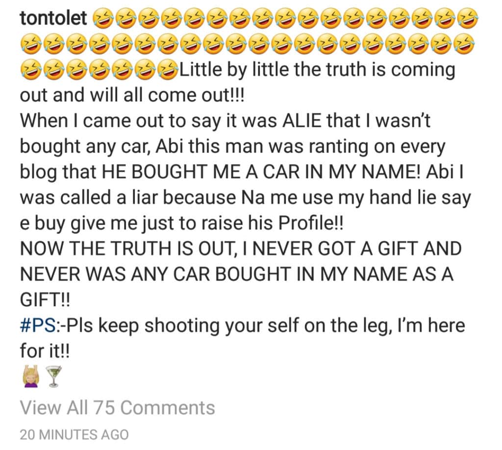 NOW THE TRUTH IS OUT, I NEVER GOT A GIFT AND NEVER WAS ANY CAR BOUGHT IN MY NAME AS A GIFT!! 22million for a fairly used bought ,lemme check if I still have that receipt #PS:-Pls keep shooting your self on the leg, I’m here for it!!