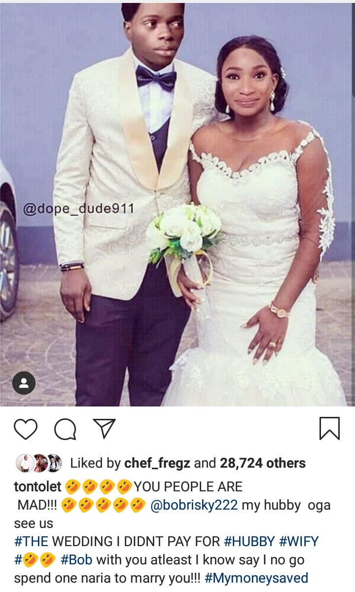 “The wedding I didn’t pay for,” the caption reads in part, adding, “Bob with you atleast I know say I no go spend one naria to marry you!!! #Mymoneysaved”