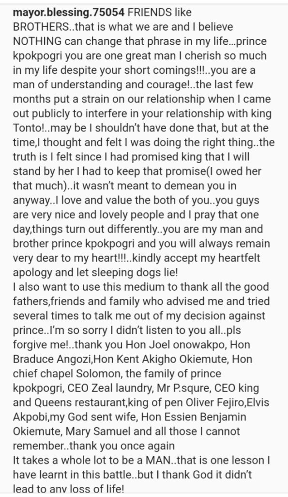 Tonto Dikeh‘s friend, Mayor Blessing who stood by her during her fight with ex lover, Kpokpogri has apologized to Kpokpogri over his actions.