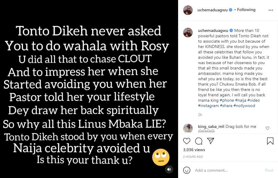“More than 10 powerful pastors told Tonto Dikeh not to associate with you but because of her KINDNESS, she stood by you when all these celebrities that follow you avoided you like Buhari kunu, in fact, it was because of her closeness to you that all this small brands made you ambassador, mama king made you what you are today, so is this the best thank you? Chukwu Emeka Bob, if all friend be like you then there is no loyal friend again, I will call you back mama king #phone #naija #video #instagram #share #nollywood”