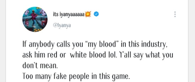 “If anybody calls you “my blood” in this industry, ask him red or white blood lol. Y’all say what you don’t mean. Too many fake people in this game”