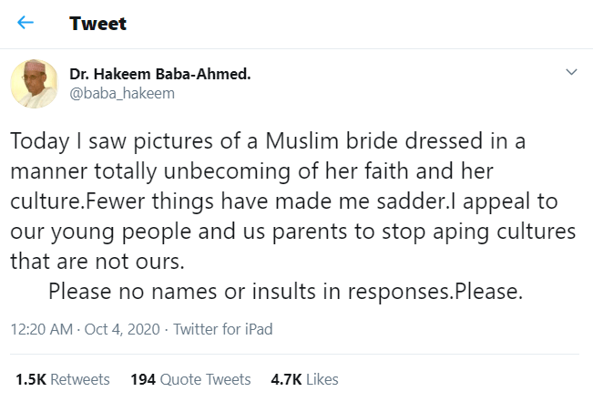 Dr. Baba Ahmed reacted to the photo via his Twitter account, appealing to Muslim youths and parents to stop copying cultures that are not Islamic.