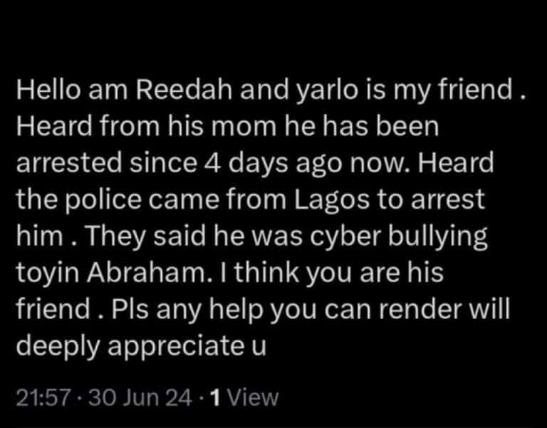 “Hello am Reedah and Yarlo is my friend. Heard from his mom he had been arrested 4 days ago. Heard the police came from Lagos to arrest him. They said he was cyberbullying Toyin Abraham. Pls, any help you can render will deeply appreciate you.”
