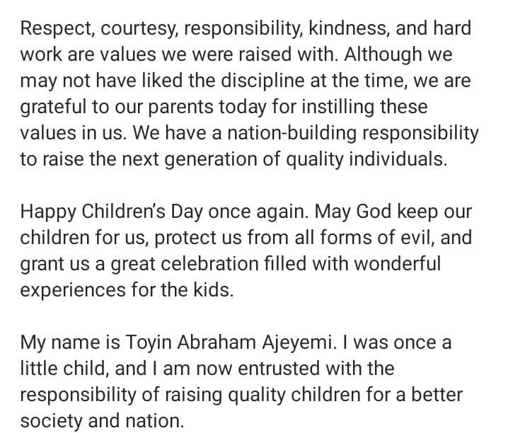 “Happy Children’s Day once again. May God keep our children for us, protect us from all forms of evil, and grant us a great celebration filled with wonderful experiences for the kids.