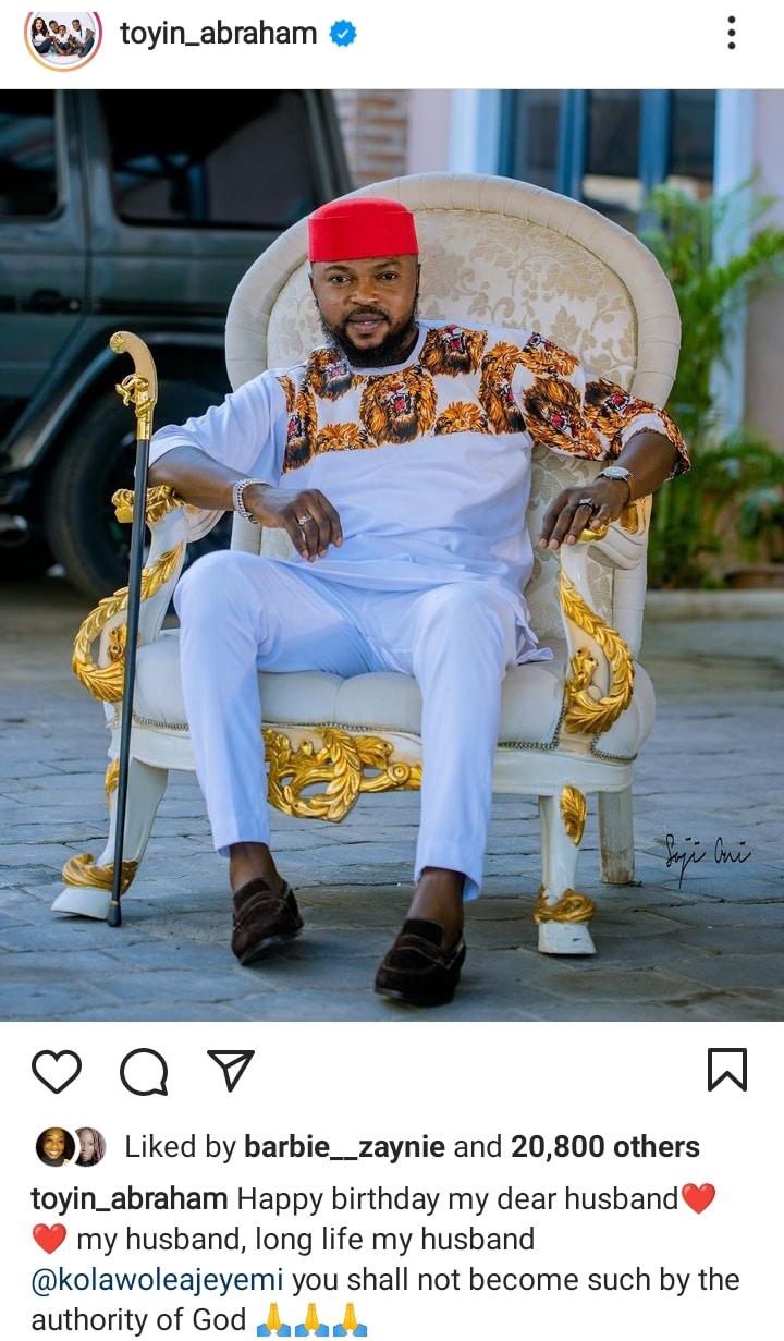 Popular Nollywood actress, Toyin Abraham has enveloped her husband, Kolawole Ajeyemi, in powerful prayers as she celebrates his new age.
