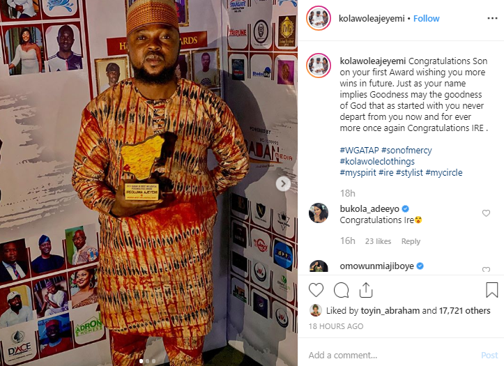 “Congratulations Son on your first Award wishing you more wins in future. Just as your name implies Goodness may the goodness of God that as started with you never depart from you now and for ever more once again Congratulations IRE .”