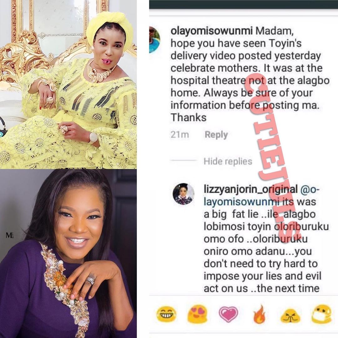 Yoruba actress, Lizzy Anjorin has called Toyin Abrahama big fat liar after she released her childbirth video to celebrate Mother’s Day.