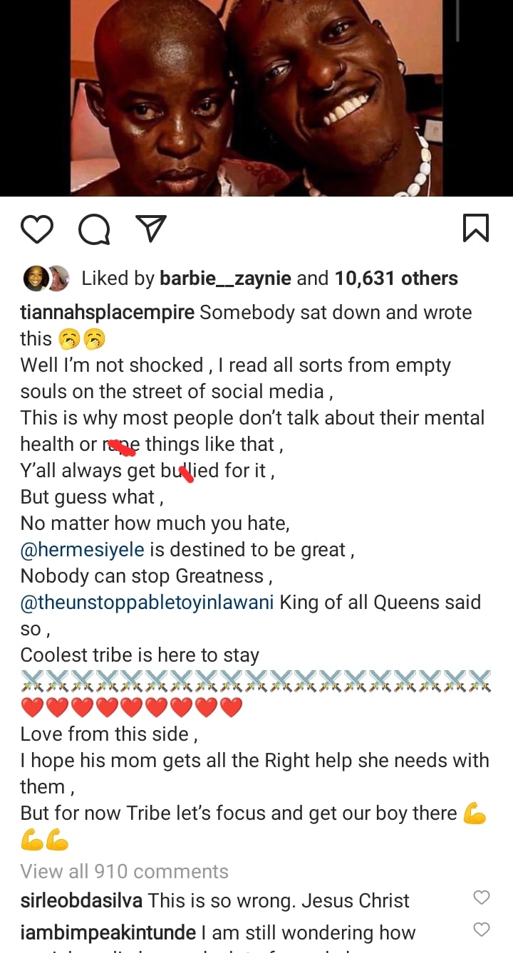 “Somebody sat down and wrote this. Well I’m not shocked, I read all sorts from empty souls on the street of social media, This is why most people don’t talk about their mental health or raaapppe things like that. Y’all always get bulliiied for it, But guess what, No matter how much you hate. @hermesiyele is destined to be great. Nobody can stop Greatness. @theunstoppabletoyinlawani King of all Queens said so, coolest tribe is here to stay. Love from this side, I hope his mom gets all the right help she needs with them, But for now Tribe lest focus and get our baby there”.