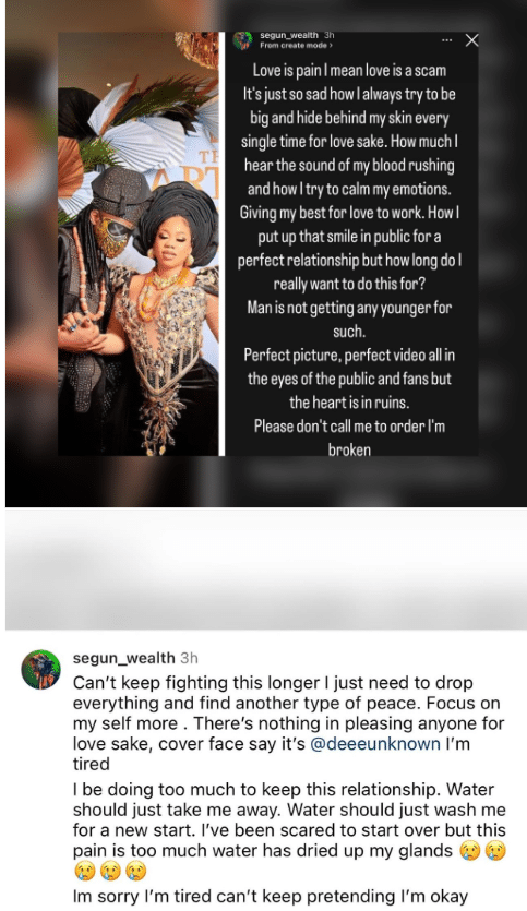 Hours ago, Segun Wealth took to his Instagram stories to vent his emotions, claiming that he was tired of pretending about their seemingly “perfect relationship.”