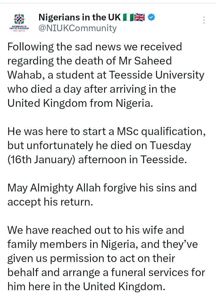 “Following the sad news we received regarding the death of Mr Saheed Wahab, a student at Teesside University who died a day after arriving in the United Kingdom from Nigeria.