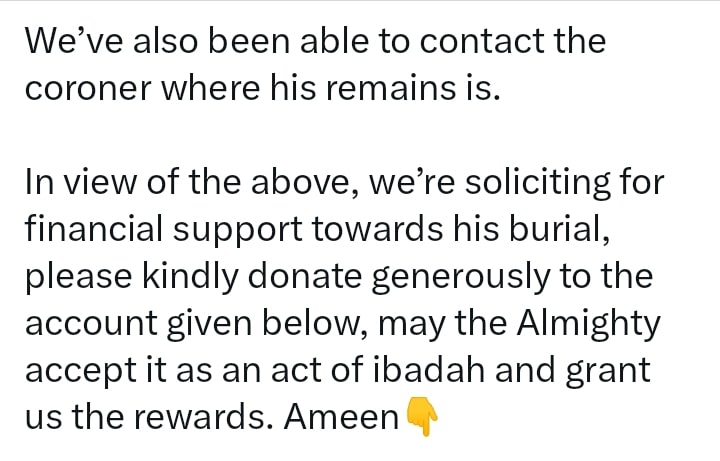 We have reached out to his wife and family members in Nigeria, and they’ve given us permission to act on their behalf and arrange a funeral services for him here in the United Kingdom.