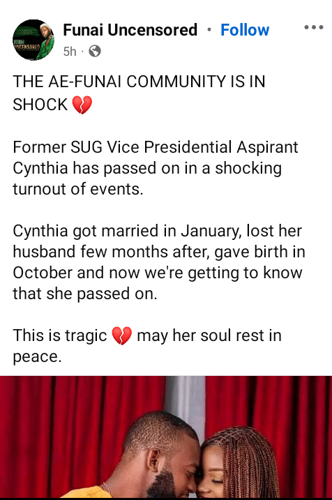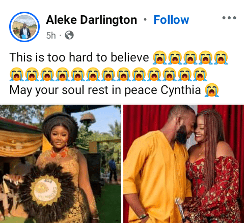 Chidimma Okolomike, a close friend, took to Facebook on Monday, November 4, to confirm the heartbreaking news of Cynthia’s passing.